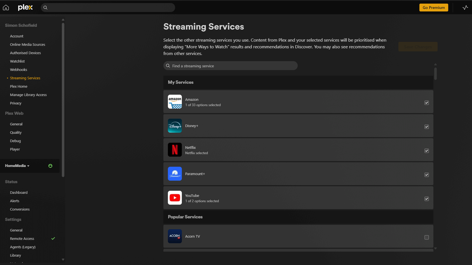 After researching various media server solutions, I chose Plex due to its intuitive user interface and positive reviews. Plex allows integration with subscription services like Amazon Prime, Disney+, and Netflix, and has dedicated apps for both Android and Apple devices. Additionally, Plex uses metadata from IMDB and Rotten Tomatoes to create a polished UI for each movie.